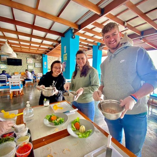 We will cook together our Peruvian National dish called “Ceviche!” the most popular dish among Peruvians! It is the national dish of Peru consisting of slices of raw fish or shellfish that is spiced with salt, onions, and chili peppers, and then marinated in limejuice, boiled sweet potatoes and corn mixed.
